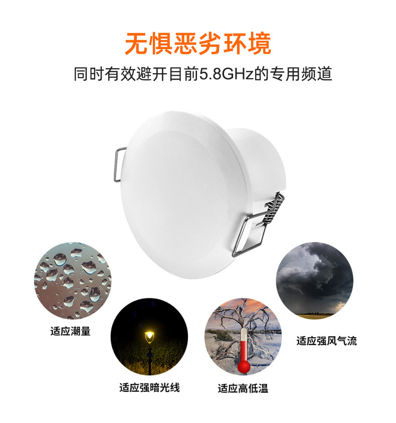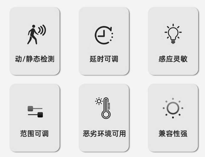 基于24GHz毫米波雷达技术,主动探测细微动作,如人呼吸带来的胸腔微动、人体局部细微动作等,从而对静态人体的识别和距离定位。相当于传统的红外人体感应器,可有效避免“人在灯却自动关闭“的尴尬。